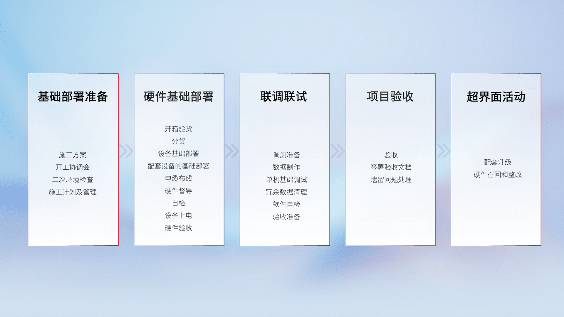 从基础部署准备、、、硬件基础部署、、、、联调联试、、、项目验收、、、、越界面活动的全过程可追溯,,,保证施工质量和进度。。。